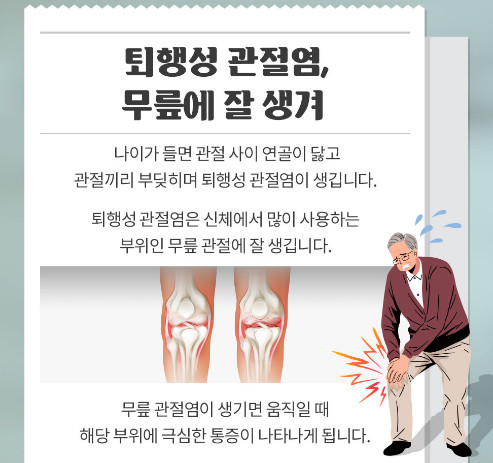 퇴행성관절염이란 관절을 보호하고 있는 연골의 점진적인 손상이나 퇴행성변화로 인해 관절을 이루고 있는 뼈와 인대 등에 손상이 일어나 통증과 염증이 생기는 질환입니다. 퇴행성 관절염은 주로 60~65세 이상 노인의 80%가 겪고 있는 아주 흔한 무릎 질환으로 최근에는 생활습관, 비만 등 여러가지 원인으로 젊은 층에서도 많이 발생하고 있습니다. 퇴행성 관절염에 걸리면 연골이 분해되면서 생기는 염증물질이 통증을 일으키게 되고 연골 파괴를 더 부추겨 관절 분해가 더 가속화되는 악순환이 발생합니다. 또한 연골이 분해되면서 관절 간격이 좁아지고 다리가 휘게 되는 내반 변형이 발생하면서 겉에서 보기에도 다리가 휘어 보이는 오다리가 생기는 부작용이 발생합니다.