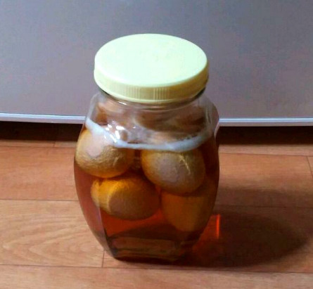 4. 10~14일 후에 유리용기 안에 있는 이물질을 체로 걸러 맑게 액만 추출해 주세요. 추출한 액은 물이나 과실즙에 희석해 음용하면 되는데, 이때 꿀을 넣어서 마시면 좀 더 쉽게 음용할 수 있어요.