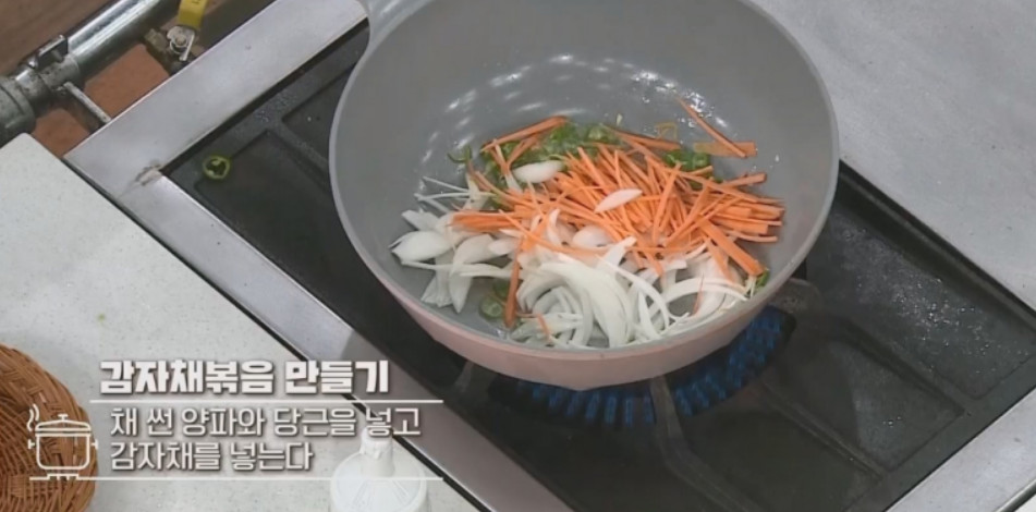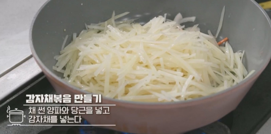 10. 감자채를 오래 볶으면 감자가 물러지기 때문에 빨리 볶아줘야 해요.