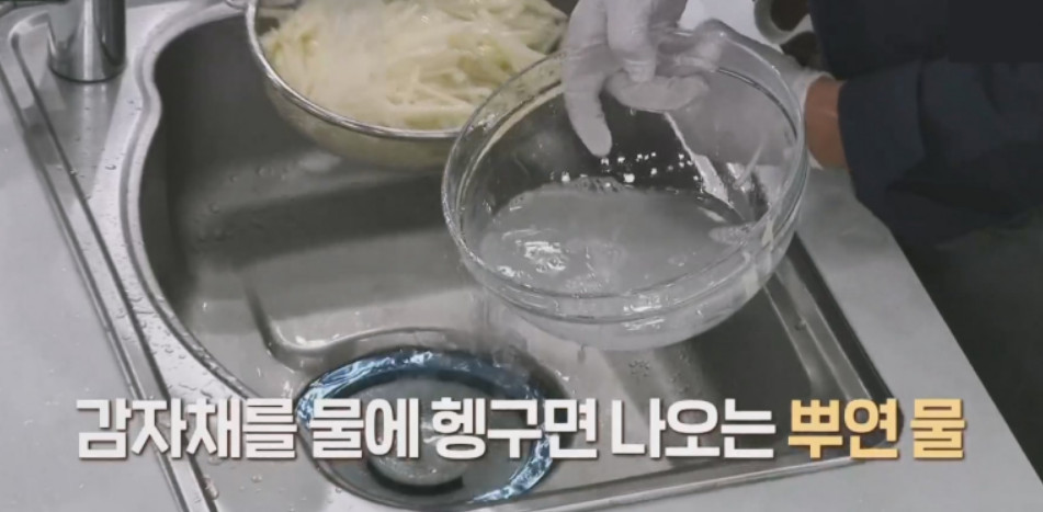 2. 가늘게 썬 감자채를 10분간 물에 담가서 전분기를 빼주세요. 감자의 전분기를 빼줘야 아삭한 식감이 살고 맛이 깔끔해진다고 해요.