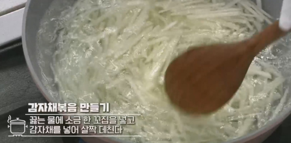 4. 끓는 물에 소금 한 꼬집을 넣고 감자채를 넣어 살짝 데쳐주세요. 끓는 물에 약 10초간 담근 뒤에 불을 끄시면 됩니다.