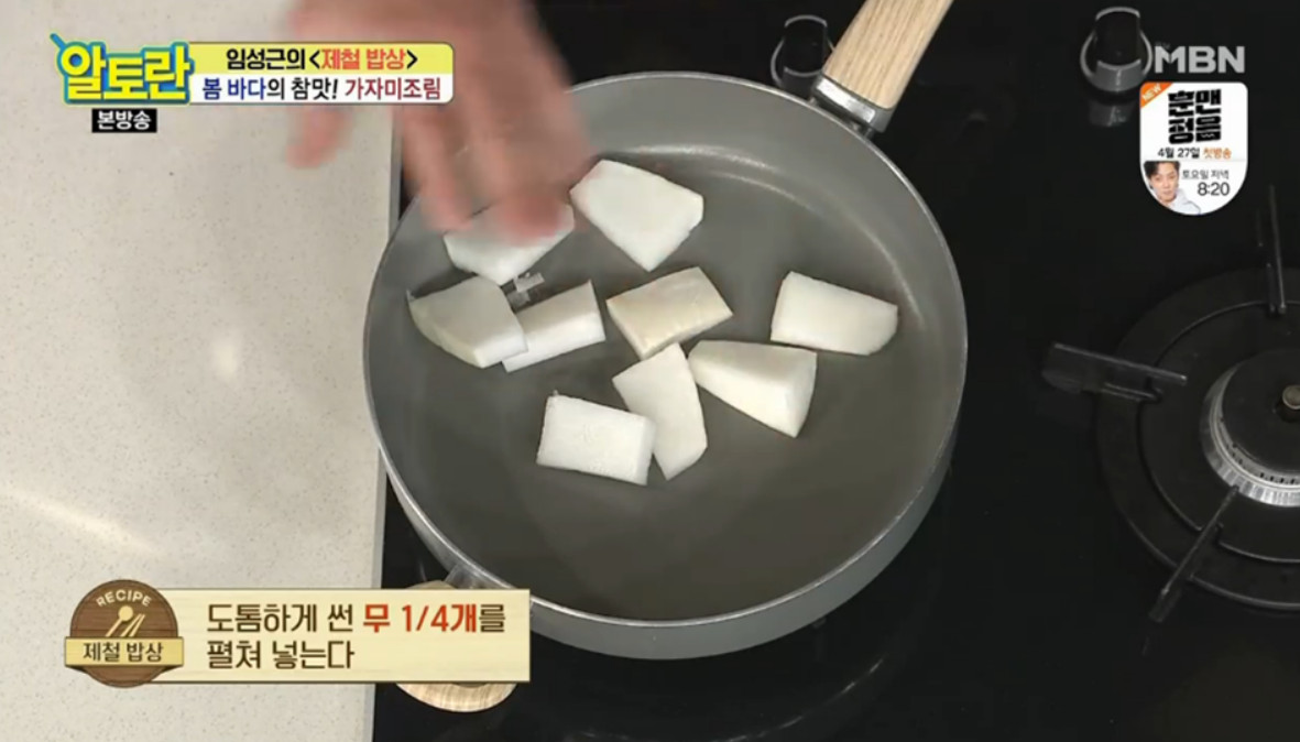 25. 널찍한 프라이팬에 도톰하게 썬 무 1/4개를 펼쳐 넣어주세요.