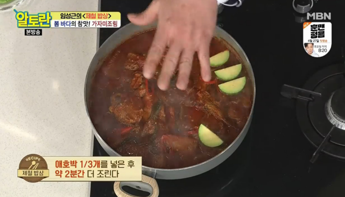 34. 마지막으로 애호박 1/3개를 넣은 후 약 2분간 더 조려주세요.