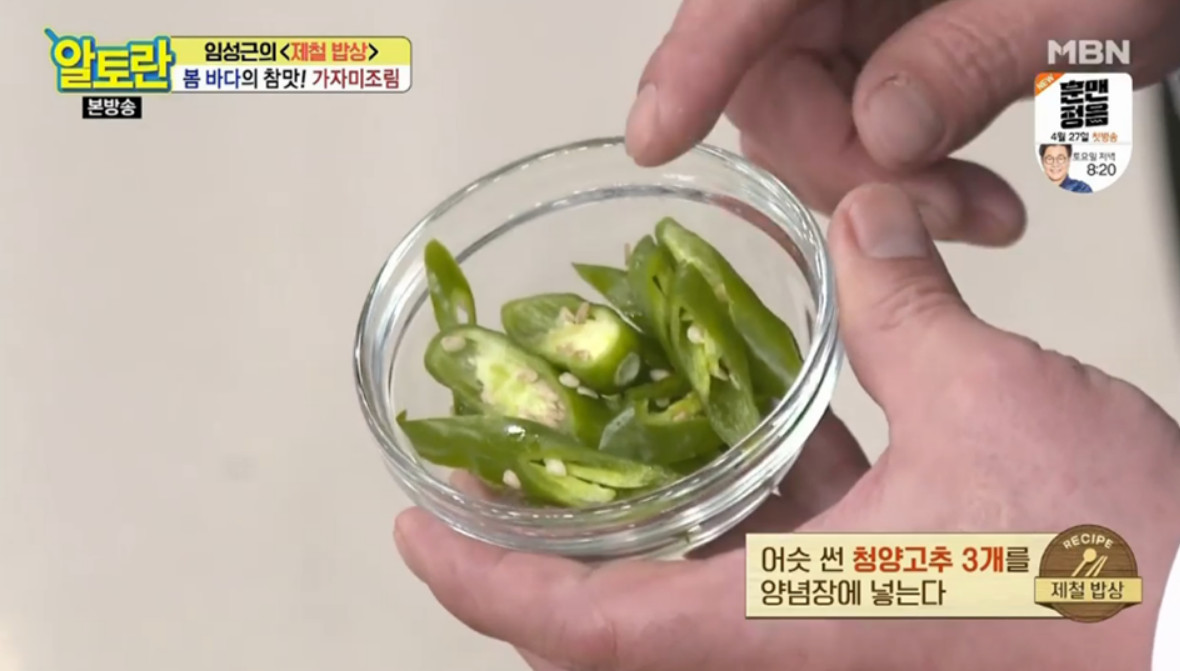 20. 어슷 썬 청양고추 3개를 양념장에 넣어주세요.