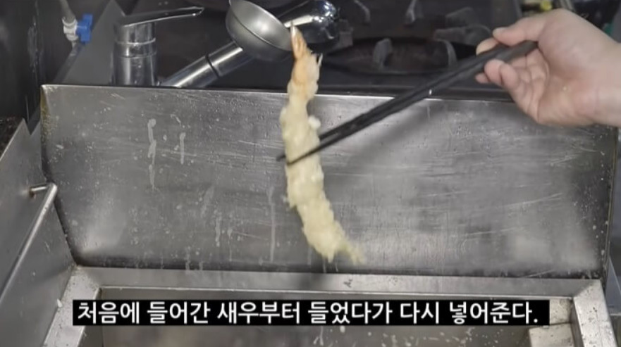 어느 정도 익으면 가장 먼저 넣었던 새우부터 한 번 들었다가 다시 기름에 넣어 주세요. 이렇게 하면 공기에 잠시 노출되어 두 번 튀기는 효과가 나서 새우튀김이 더 바삭하게 완성됩니다. 이제 새우튀김을 바삭하게 만드는 방법을 아셨죠?