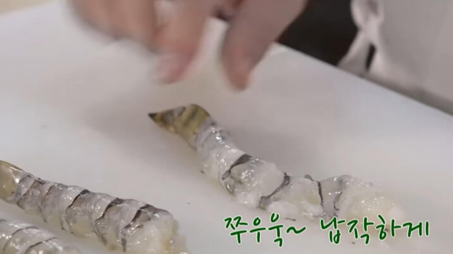새우를 등 쪽이 아래로 오도록 눕혀 주세요. 그 후, 몸통 부분에 대각선으로 칼집을 내줍니다. 다시 새우를 뒤집은 후, 양손으로 마디 부분을 평평하게 눌러주세요.