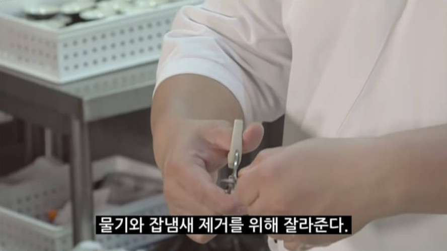 꼬리의 뾰족한 부분은 가위로 잘라내세요. 이 부분에 수분이 많아서 튀길 때 기름이 많이 튈 수 있어요. 또한 잡냄새가 날 수 있는 부분이기 때문에 깨끗하게 제거해 주는 것이 좋아요.