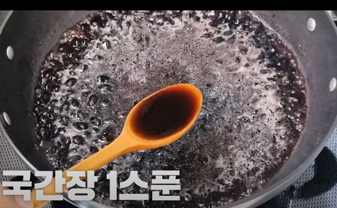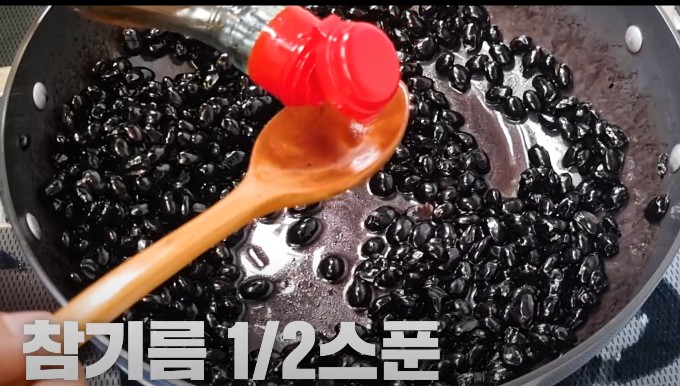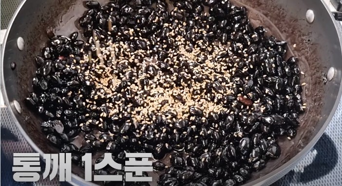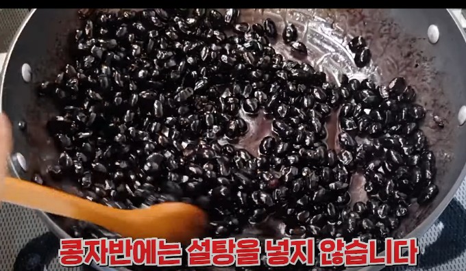 조청이 충분히 있으니 2스푼을 추가해 주세요. 콩자반에는 설탕을 사용하지 않아요. 설탕을 넣으면 딱딱해지고, 오랫동안 보관하기도 어려워요.
