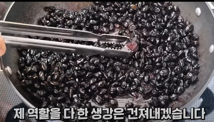 이제 불을 끄고, 다 쓴 생강은 건져냅니다.