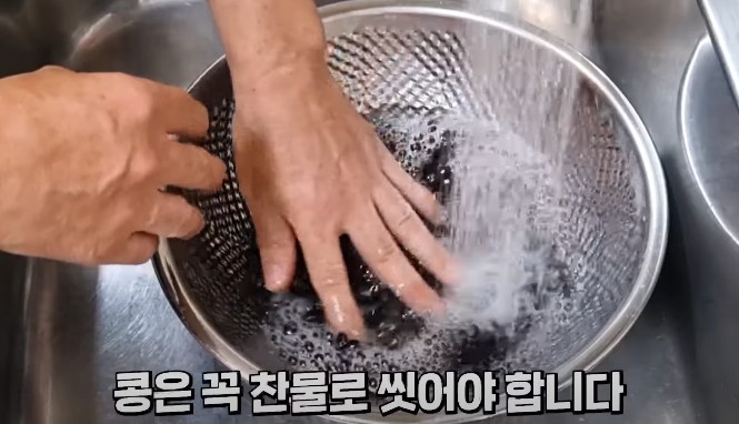 찬물로 콩을 씻어주세요. 콩은 반드시 찬물로 씻어야 해요. 따뜻한 물로 씻으면 콩에서 비린내가 날 수 있답니다.