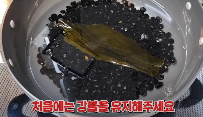 씻은 콩을 냄비에 넣고, 물 750ml 중 2/3 정도를 부어주세요. 여기에 건다시마 5g도 추가한 후 불을 켜 주세요. 처음에는 강불로 유지하는 것이 좋습니다.