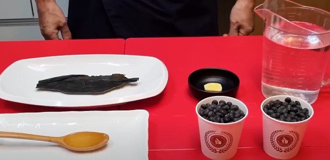2. 콩, 물 500ml, 건다시마, 생강을 넣고 강한 불에서 뚜껑을 열고 10분 동안 끓입니다.