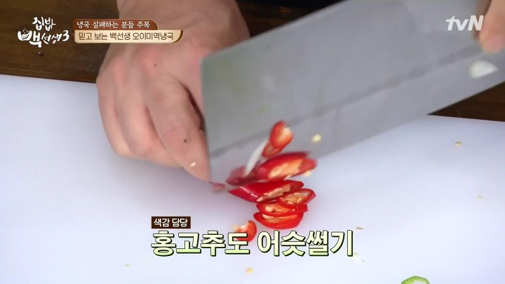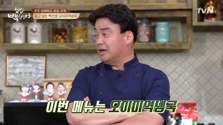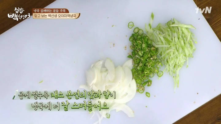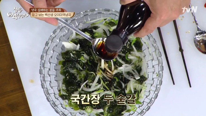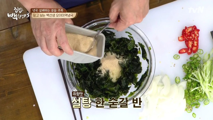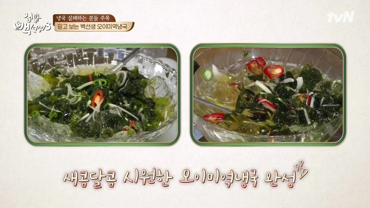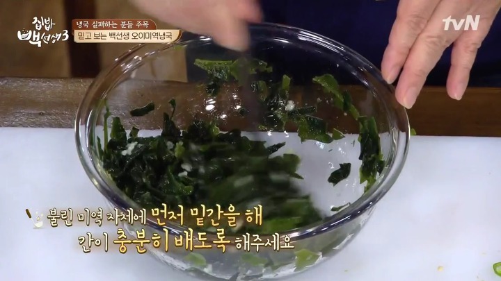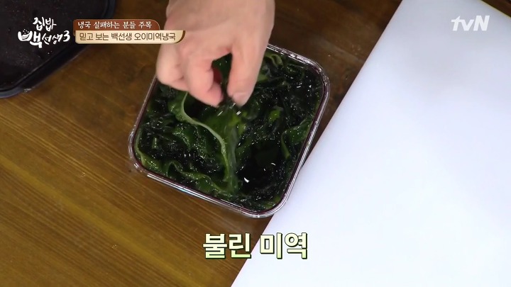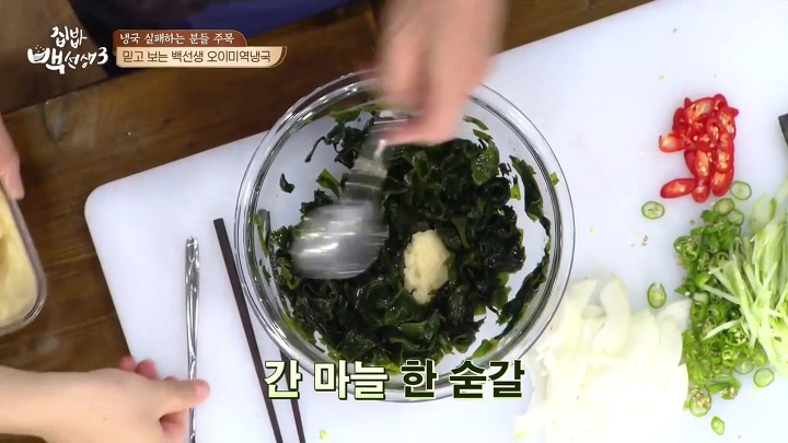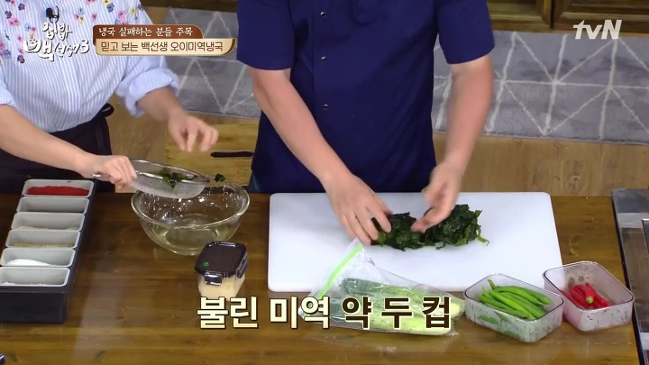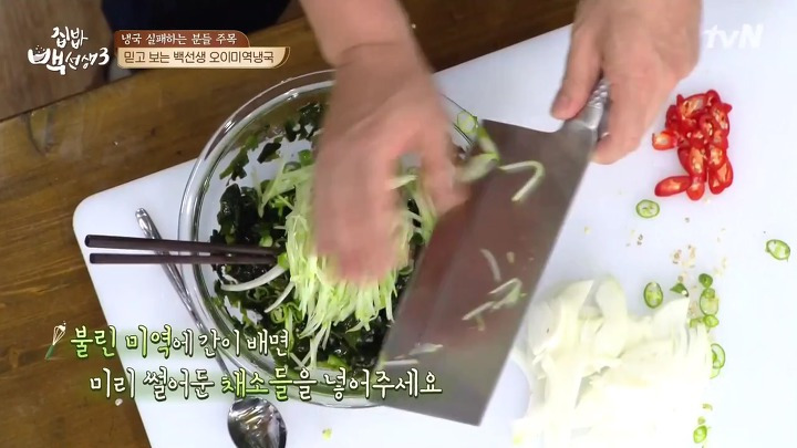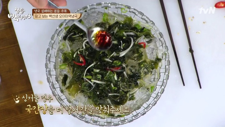 가장 많이 먹는 냉국인 미역냉국 만드는 방법이에요. 오이는 호불호가 있어 빼고 만들지만, 백샘은 오이를 넣어서 드신다고 하더라고요. 마지막에는 여러 가지 버전으로 몇 가지를 만들어 놓으시더군요! :)