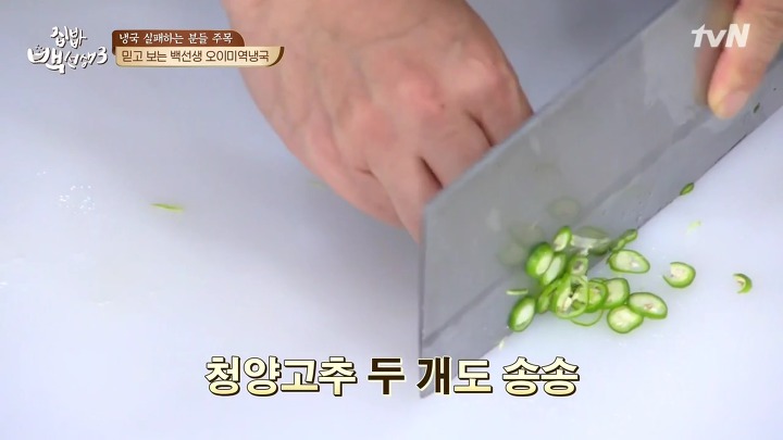 ※ 재료 중에서 홍고추는 색깔을 내기 위해 생략해도 괜찮아요. 하지만 청양고추는 필수입니다. 냉국이 약간 매콤해야 하므로 청양고추는 꼭 넣어야 하고, 매운 것을 싫어하신다면 1개 정도만 넣으시면 됩니다.