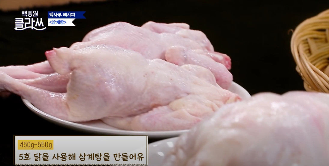 닭은 5호 닭, 즉 영계로 준비해요. 5호 닭은 450g에서 550g 정도의 크기인데, 닭도 크기별로 호수가 나뉘어 있어요. 소(5~6호)는 삼계탕에 적합하고, 중소(7~9호)는 튀김 요리(치킨)용으로 사용해요. 중(10~12호)과 대(13~14호)는 백숙이나 닭볶음탕에 적합하답니다. 이렇게 크기별로 호수가 정해져 있고, 용도가 다르대요.