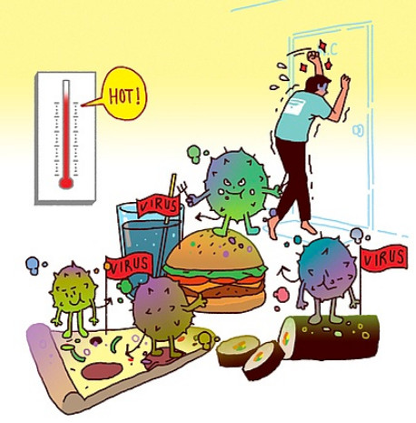 여름철에 발생하는 장염의 대부분은 음식으로 인해 발생합니다. 따라서 습하고 더운 날씨에는 음식을 충분히 익혀 먹는 것이 매우 중요합니다. 특히 세균 번식이 잘 되는 어패류는 중심부 온도가 85℃에 도달할 때까지 잘 익혀야 합니다. 또한 조리할 때는 칼과 도마를 자주 세척하고 소독하며, 조리된 음식이 상온에 오랫동안 방치되지 않도록 주의해야 합니다. 남은 음식을 냉장고에 보관하는 것도 좋은 방법이지만, 조리할 때 먹을 만큼만 준비하여 남기지 않는 것이 가장 바람직합니다.