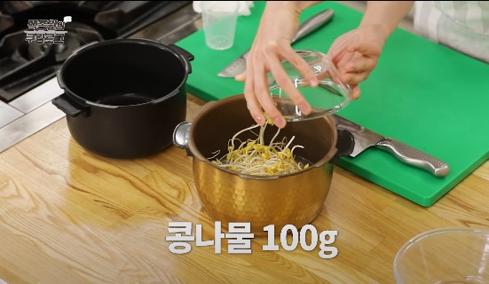 밥솥에 쌀 2컵과 물 2컵을 넣고, 그 위에 콩나물 100g을 추가해 주세요.