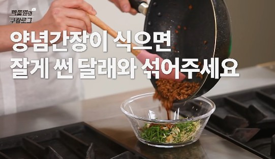 고기를 볶은 양념간장을 충분히 식힌 다음, 잘게 썬 달래와 함께 섞어주세요.