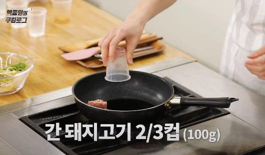 팬에 진간장 1/2컵을 붓고, 간 돼지고기 2/3컵을 추가해요.