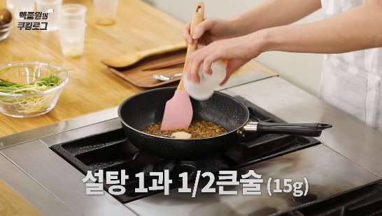 설탕 1/2큰술을 넣고, 돼지고기를 익히면서 계속 저어주세요.
