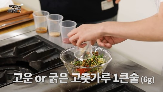 고춧가루 1큰술, 간 마늘 1큰술, 깨소금 1/2큰술, 참기름 1큰술을 넣고 잘 섞어주세요.