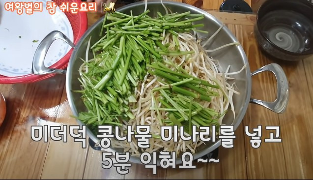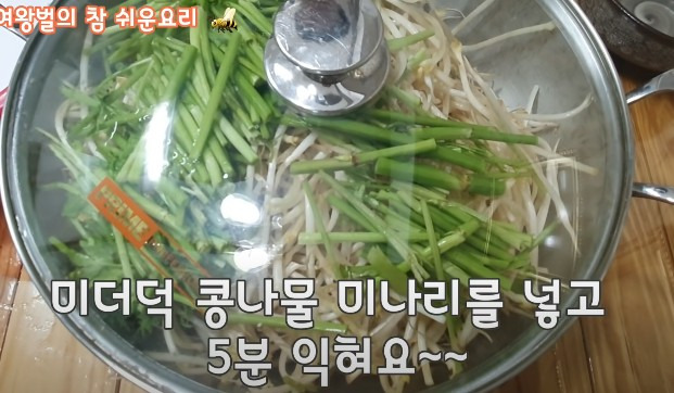 손질한 콩나물을 넣고, 그 위에 미나리를 올려주세요.