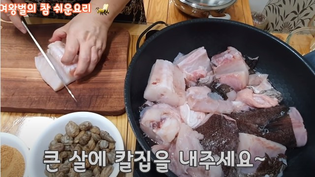 냉동된 아구를 사용하고, 아구의 두툼한 살 부분에 칼집을 넣어주세요.