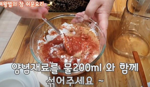 전분가루 4큰술과 다진 마늘 1큰술을 넣고, 그 후에 물 200ml를 추가해 잘 섞어주세요.