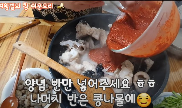 5분 후 남은 양념장을 넣고 잘 섞어주세요. 양념장은 두툼한 아구에 충분히 넣어 양념이 잘 배게 하고, 남은 양념으로 콩나물을 버무리는데, 나중에 함께 섞을 것이니 콩나물의 양념이 적어도 괜찮아요.
