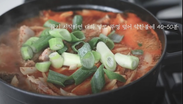 끓기 시작하면 대파를 썰어 넣고, 뚜껑을 덮은 후 약한 불에서 40~50분 정도 졸여주세요.