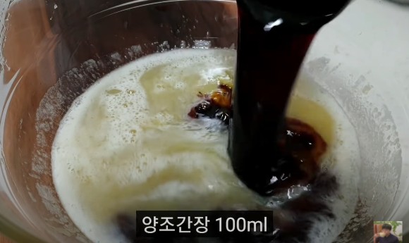 양조간장 100ml와 맛술 2큰술을 넣어주세요.