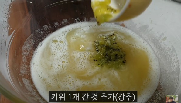 여기에 키위 1개를 갈아 넣어주세요. 키위를 추가하는 것을 강력히 추천해요. 연육 작용을 도와줘서 더욱 맛있답니다~