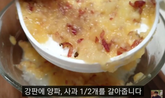 강판에 양파 반 개와 사과 반 개를 갈아준 후, 면보를 이용해 즙만 짜주세요. 즙만 사용하면 훨씬 깔끔해요. 사과즙이나 양파즙이 있다면 바로 사용하면 더 편하겠죠.