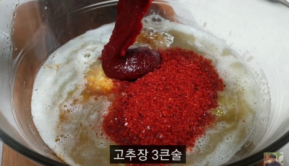 설탕 1큰술, 다진마늘 2큰술, 다진 생강 1작은술, 물엿2큰술, 고춧가루 4큰술, 고추장 3큰술, 참기름 1큰술, 후추 1/3작은술을 모두 넣고 골고루 잘 섞어줍니다.