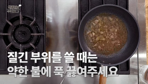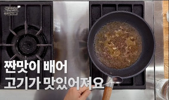 불을 약하게 설정한 후, 기름이 녹아 참기름과 식용유가 섞일 때까지 천천히 볶아주세요. 고기가 노릇해질 때까지 충분히 볶아주면, 고기에서 나온 기름이 국물에 스며들어 맛이 한층 더 깊어져요.