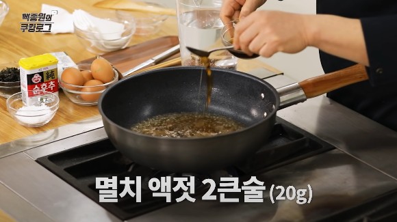 고기를 충분히 볶은 뒤, 먼저 고기가 잠길 정도로만 물을 조금 붓고, 그 위에 꽃소금 1큰술과 국간장 3큰술을 넣어 국물의 색과 향을 내주세요. 그리고 멸치액젓 2큰술도 추가해줍니다.