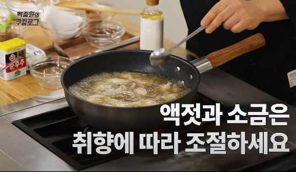 물이 끓기 시작하면 떡과 만두를 넣어주세요. 간 마늘 1큰술을 넣고, 소금과 액젓으로 입맛에 맞게 간을 조절해요. 대파는 함께 넣어 끓이거나, 마지막에 고명으로 올려줘도 좋아요.