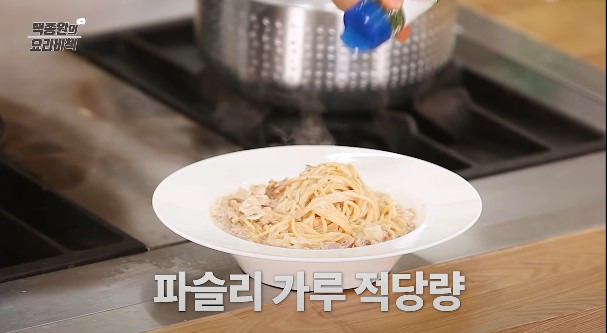 젓가락으로 면을 돌돌 말아 접시에 담고, 파슬리 가루를 적당히 뿌려 마무리합니다.