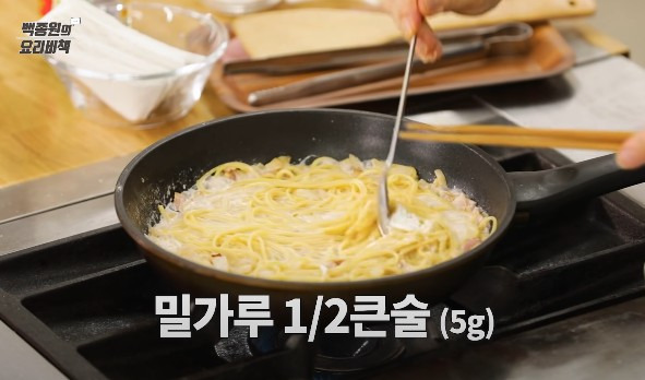 소스가 끓기 시작하면 파스타 면을 넣고 소스에 잘 조려주세요. 이때, 농도를 맞추기 위해 밀가루를 1/2큰술 정도 넣어 섞어줍니다.