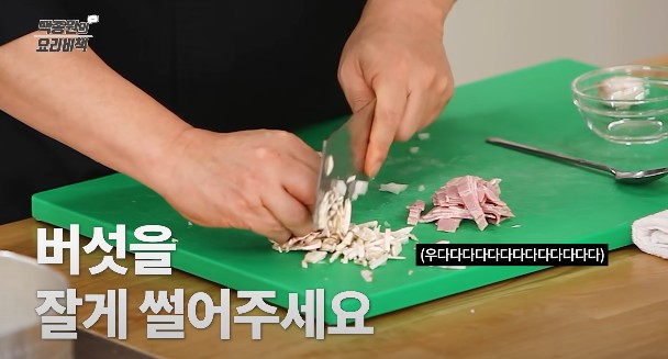 베이컨은 원하는 양만큼 넣고, 크기는 적당하게 잘라주세요. 양파는 많이 넣어줄수록 좋으며, 채 썰어도 괜찮지만 가능한 잘게 다져주는 것이 좋아요. 양송이버섯도 2개 정도 준비해 편으로 썰거나 잘게 썰어줍니다.