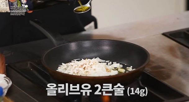팬에 준비한 베이컨, 양파, 양송이버섯을 넣고 올리브유 2큰술을 둘러주세요. 중약불에서 천천히 볶아주며, 양파가 충분히 노릇해지고 맛이 잘 배어나올 때까지 볶아주세요.