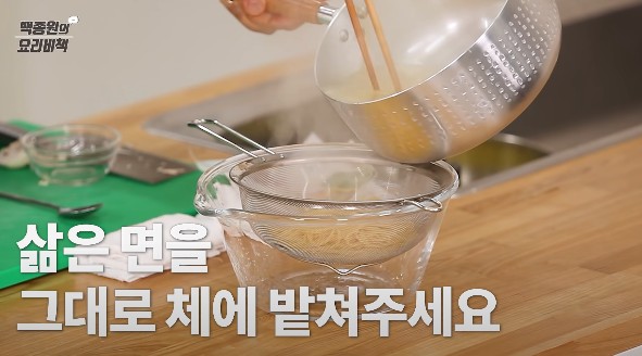 삶아낸 면은 그대로 체에 밭쳐 물기를 빼주세요. 파스타 면은 찬물에 헹구지 않는 것이 좋아요.