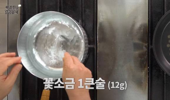 냄비에 물 약 1.5리터와 꽃소금 1큰술을 넣어주세요. 스파게티 면을 충분히 삶아야 하므로 물은 넉넉하게 붓는 게 좋아요. 꽃소금을 넣어 삶으면 면에 은은하게 간이 배어, 소스를 만들 때 이 면수를 사용하면 더욱 맛이 살아나요.