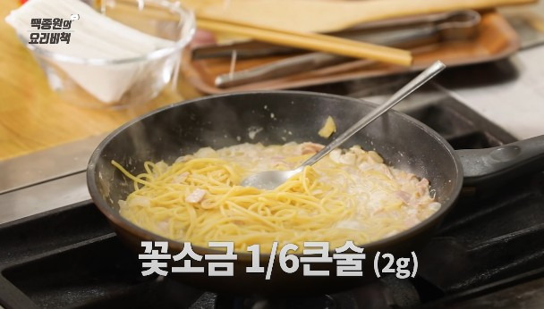 크림파스타의 포인트는 면을 소금 넣은 물에 삶는 것과 양파를 충분히 오래 볶아 깊은 맛을 내는 거예요. 치킨 육수를 살짝 넣으면 풍미가 한층 더해지고, 면을 약간 덜 익힌 상태로 소스에 졸이며 익히면 소스가 면에 잘 배어 더욱 진한 맛이 납니다.