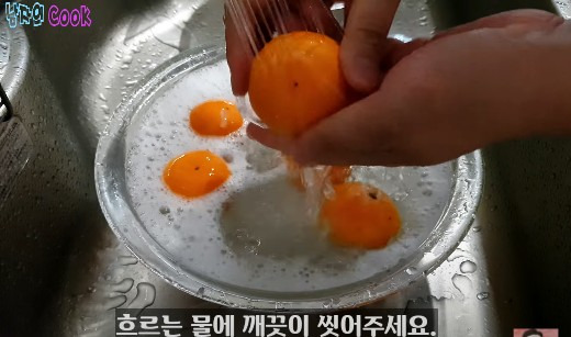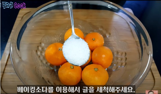 귤에 베이킹소다 1스푼을 넣고, 미지근한 물을 부어 약 5분 동안 담가 두세요.