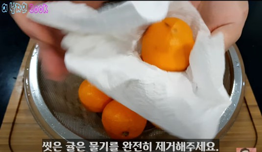 세척한 귤은 물기를 완전히 제거하는 것이 중요해요. 물기가 남아 있으면 청을 만들었을 때 곰팡이가 생기거나 쉽게 상할 수 있으니, 키친타월이나 마른 행주로 남은 물기를 꼼꼼히 닦아주세요.