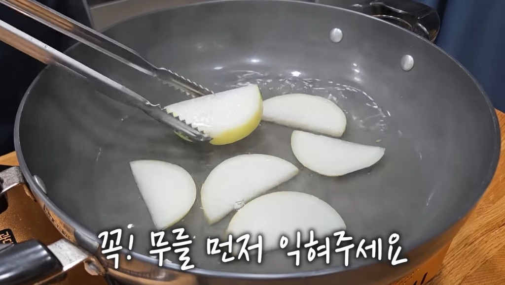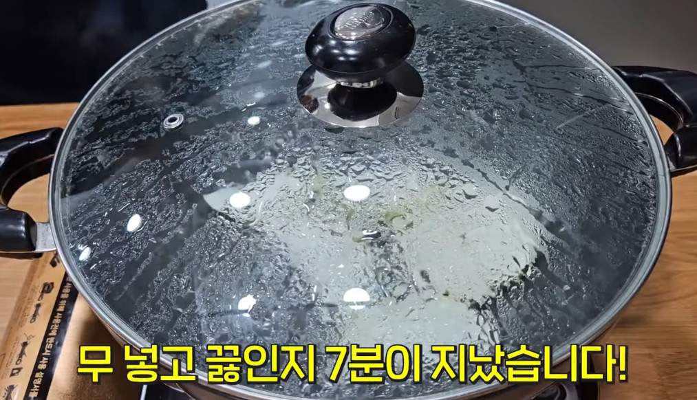 9. 무만 넣은 상태에서 뚜껑을 닫고 중불에서 7분정도 끓여주세요.