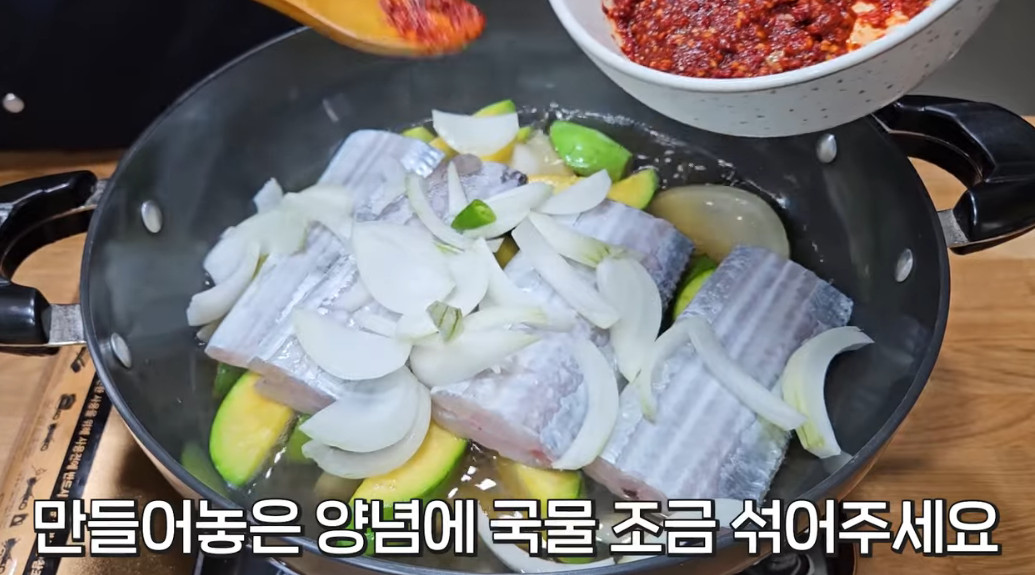 14. 썰어놓은 양파를 위에 얹고 만들어놓은 양념도 육수와 조금씩 섞어 풀어준 뒤 위에 끼얹어주세요.