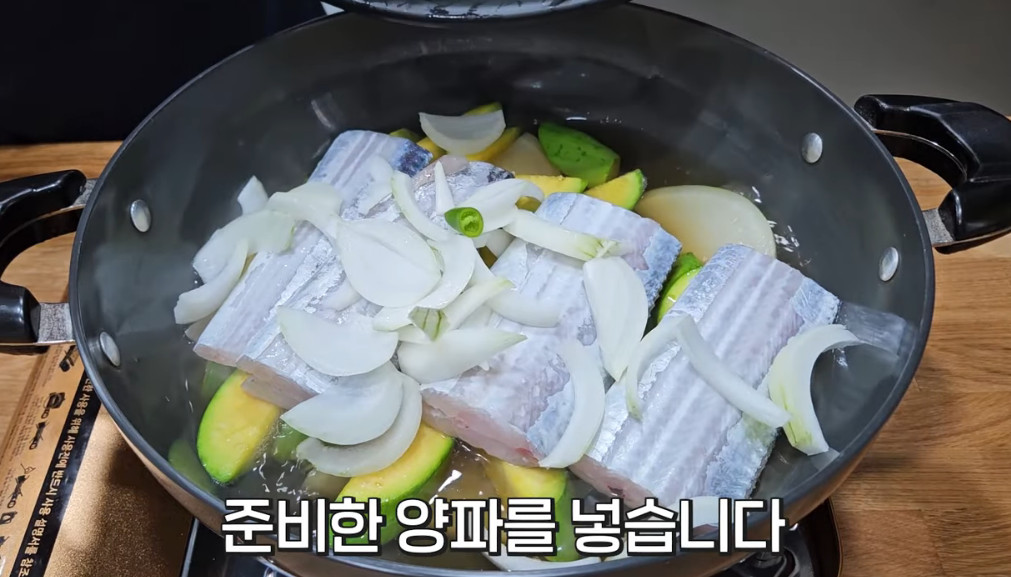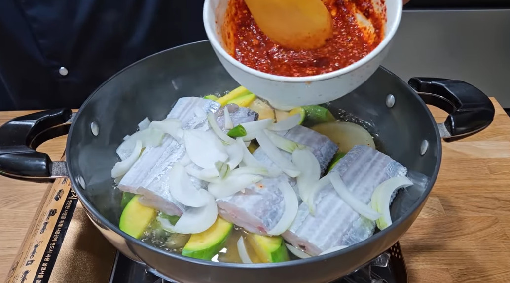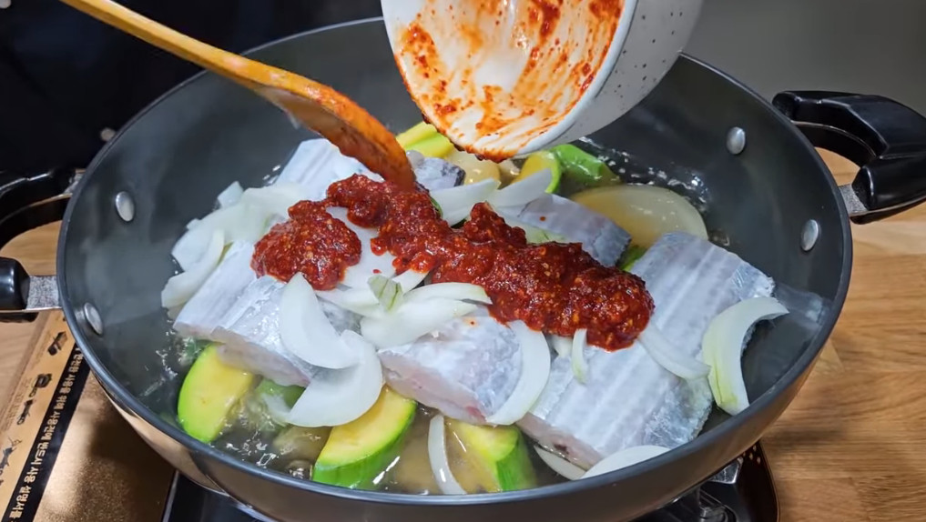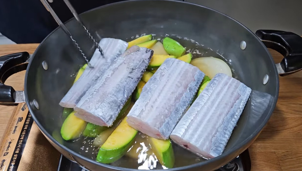 13. 무를 넣고 끓인지 7분이 지났으면 절여놓은 애호박과 갈치 1마리를 넣어주세요. (이렇게 무를 먼저 초벌로 익혀주지 않으면 나중에 갈치는 다 익었는데 무가 익지 않는 상황이 발생합니다. 그러니 꼭 무를 먼저 익혀주세요)