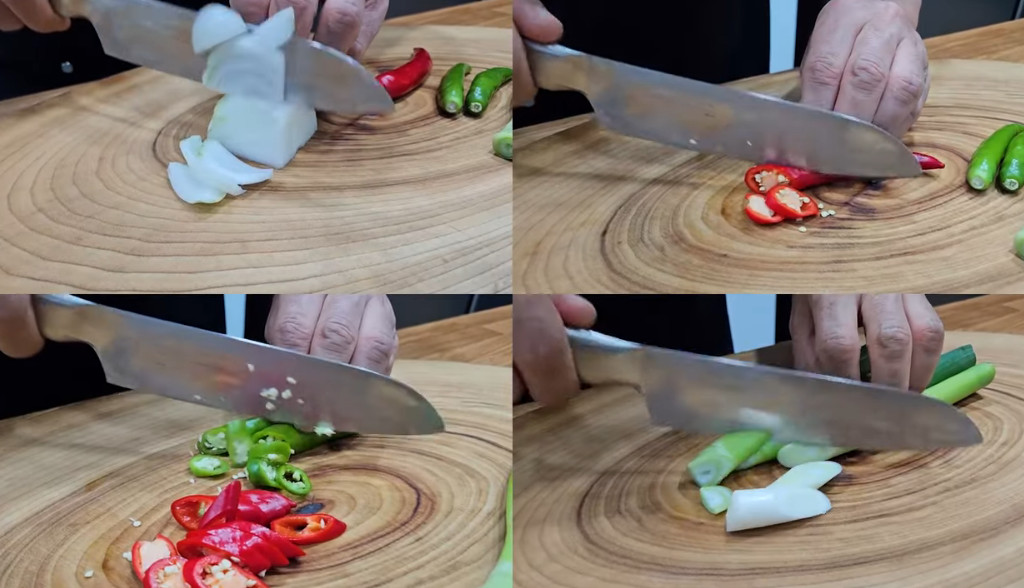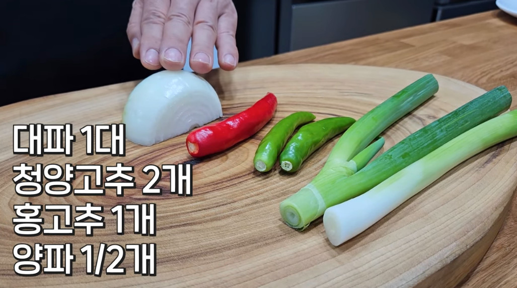 5. 대파 1대, 청양고추 2개, 홍고추 1개, 양파 1/2개를 적당한 크기로 썰어주세요.